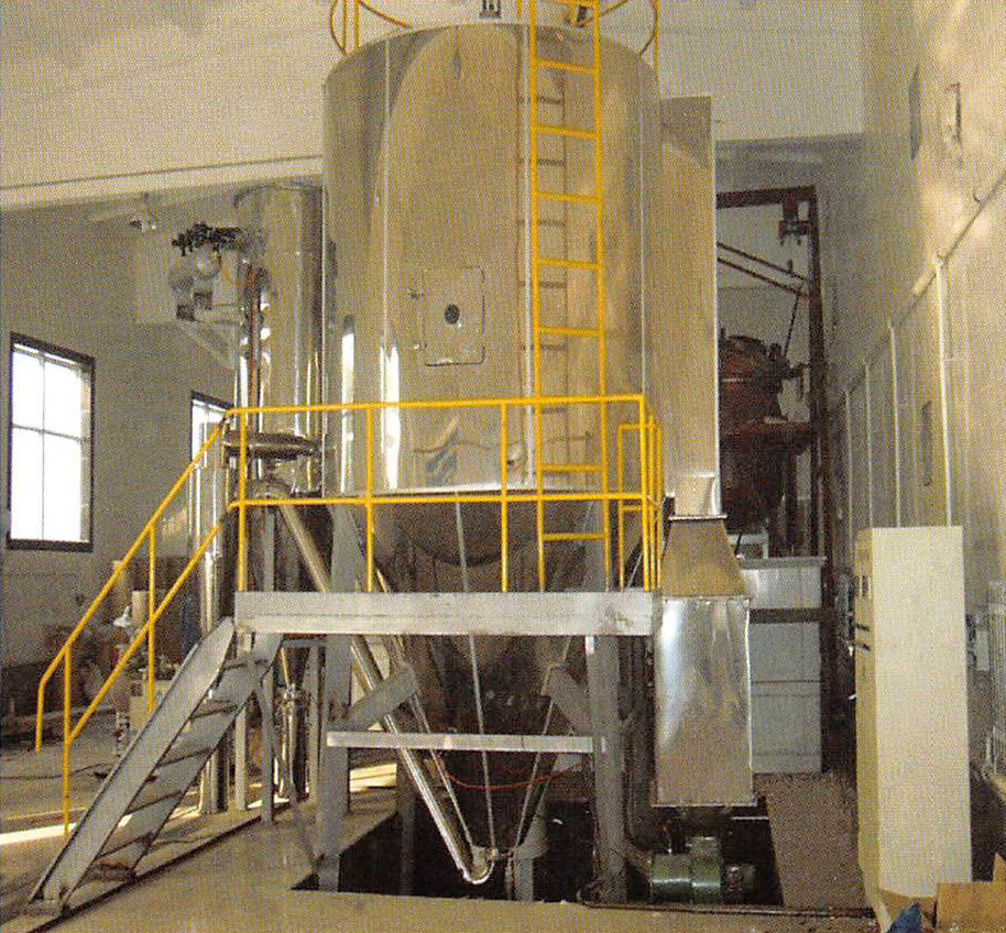空氣通過過濾器和加熱器,進(jìn)入干燥塔頂部的空氣分配器,然后呈螺旋狀均勻進(jìn)入干燥室。料液由料液和熱空氣并流接觸,水份迅速蒸發(fā),在極短的時(shí)間內(nèi)干燥為成品。成品由干燥塔底部和旋風(fēng)分離器排出,廢氣由風(fēng)機(jī)排出。