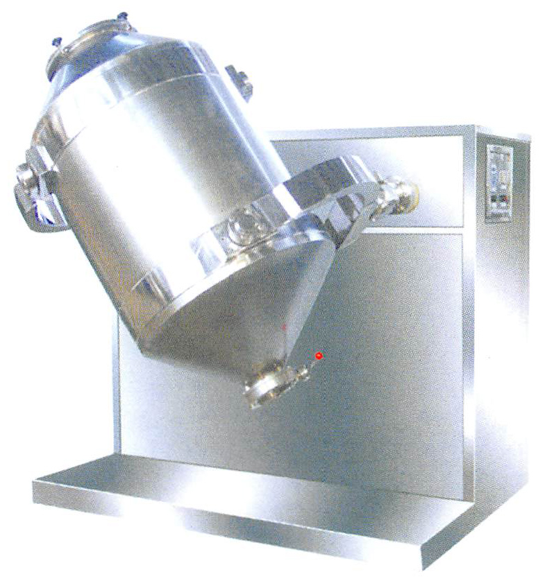 ※ Structure: this machine consists of stand, transmission system, electric control system, multi-directional motion mechanism, mixing drum and so on. The mixing drum contacted with raw material is made of stainless steel. The inner and outer wall of drum is polished.